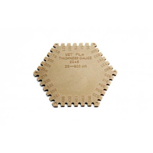 Grzebień do pomiaru powłok mokrych wykonany z plastiku. Jedna strona wyskalowana w mikrometrach (µm) druga w milsach (mills).