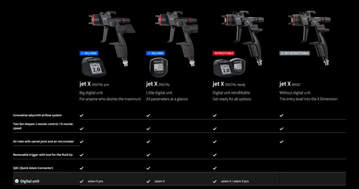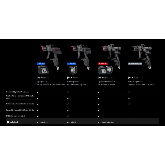 Pistolet SATA JET X DIGITAL READY ma możliwość korzystania z ADAM X, ale nie ma go na wyposażeniu. Ma zdejmowany spust z kluczem do odkręcania dyszy materiałowej. Jest idealnym rozwiązaniem jako kolejny pistolet, dla kogoś kto już ma pistolet DIGITAL lub DIGITAL PRO.