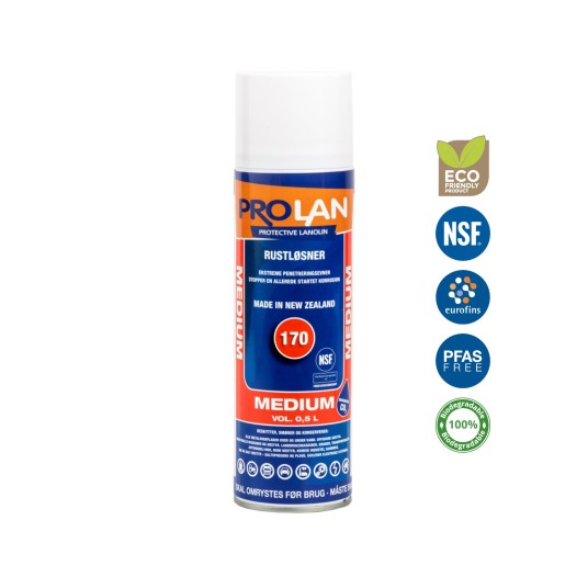 Prolan Medium 170 SPRAY to uniwersalny, wielofunkcyjny smar w sprayu na bazie lanoliny mający właściwości antykorozyjne, dodatkowo wykazujący silne działanie penetrujące. Produkt posiada certyfikat NSF H1 pozwalający do incydentalnego kontaktu z żywnością.