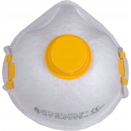 Półmaska filtrująca FS-16V FFP1V NR D to solidny artykuł BHP dedykowany ochronie dróg oddechowych. Skutecznie chroni przed pyłami i aerozolami ciekłymi do 4 x NDS. Kopułowy kształt i trójwarstwowa konstrukcja sprawia, że półmaska łatwo dopasowuje się do kształtu i wielkości twarzy. Wstępne wyprofilowanie pozwoliło na rezygnację z blaszki bez zmniejszenia szczelności. Zapewnia stabilność osadzenia i wygodę użytkowania. Maska przeciwpyłowa FS-16V FFP1V NR D przeznaczona jest do pracy w przemyśle spożywczym, rolniczym, drzewnym oraz w kamieniołomach. Zastosowanie do pyłów nietoksycznych: przemysł rolniczy, spożywczy, praca w kamieniołomach, cementowniach, a szczególnie do takich pyłów jak węglan wapnia, grafit naturalny i syntetyczny, gips, kreda, cement, tynk, marmur, tlenek cynku, pyłki roślinne, celuloza, siarka, bawełna, opiłki metali żelaznych, pył węglowy zawierający poniżej 10% wolnej krzemionki